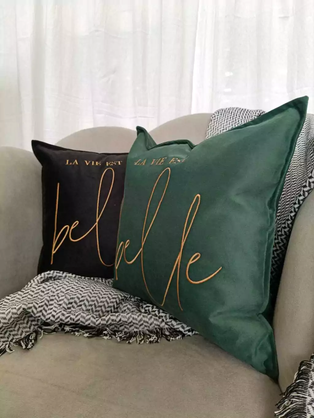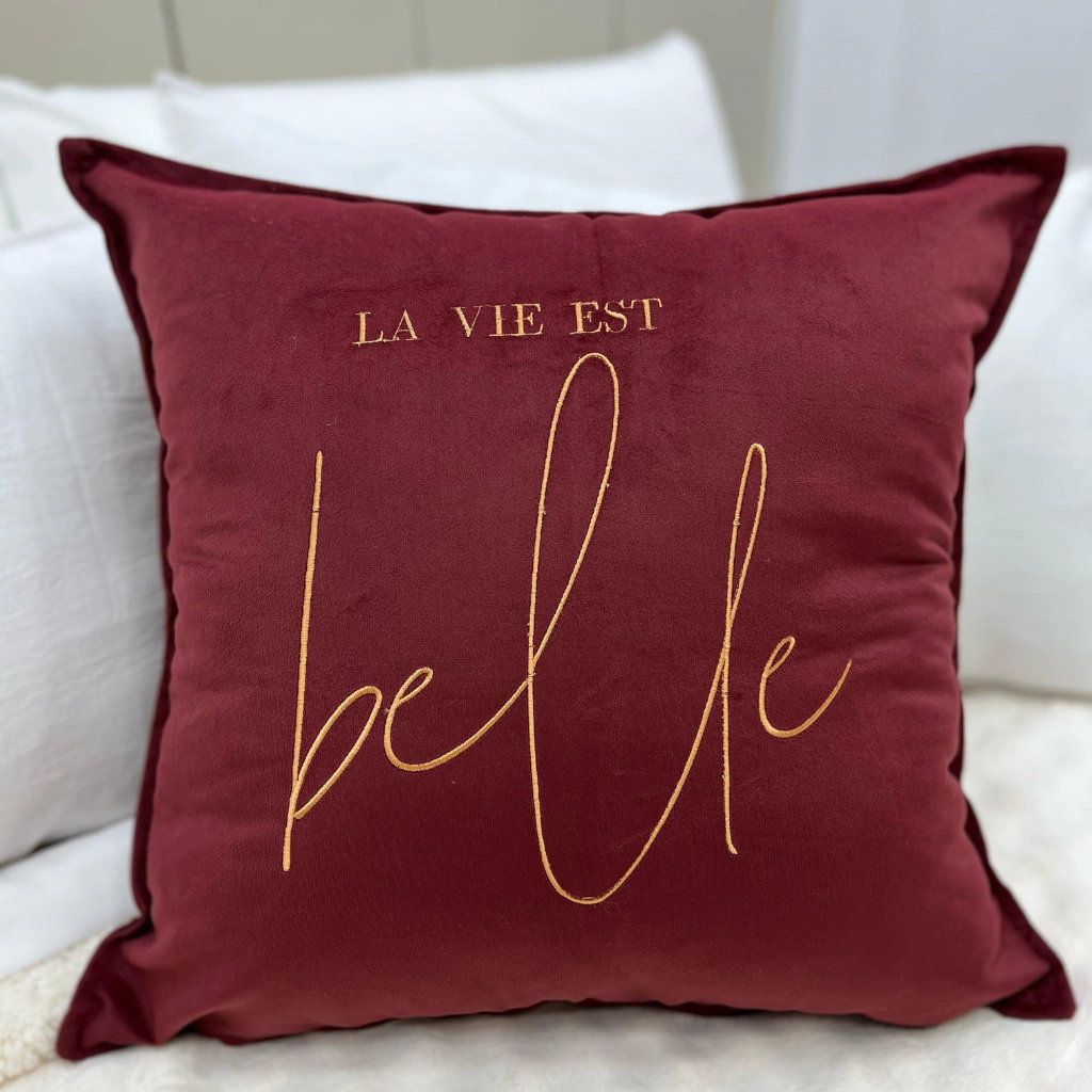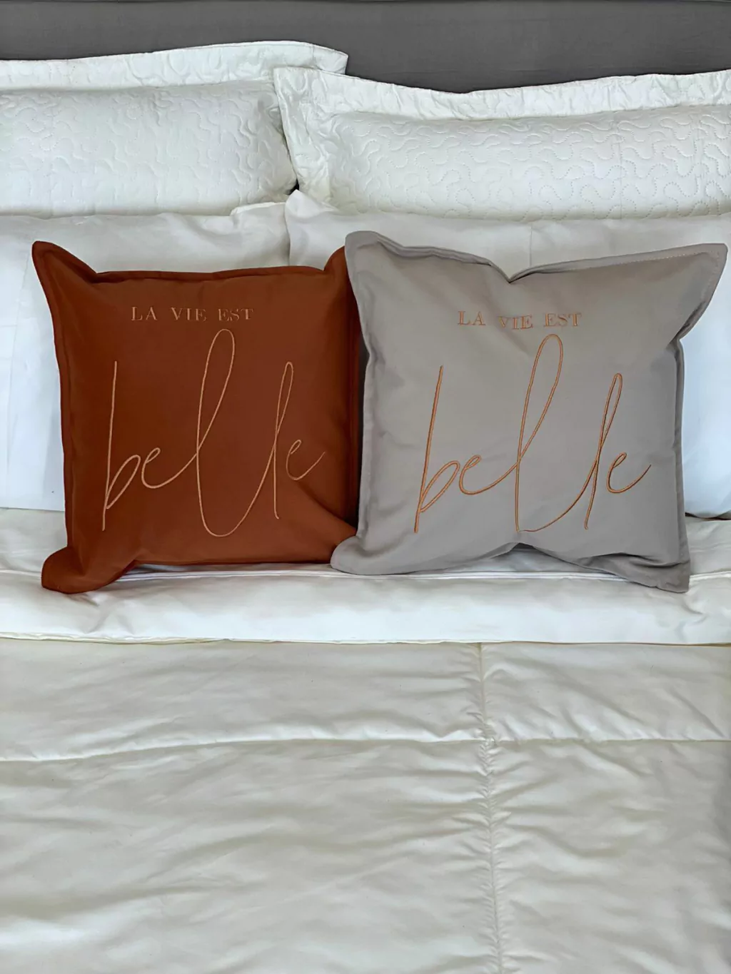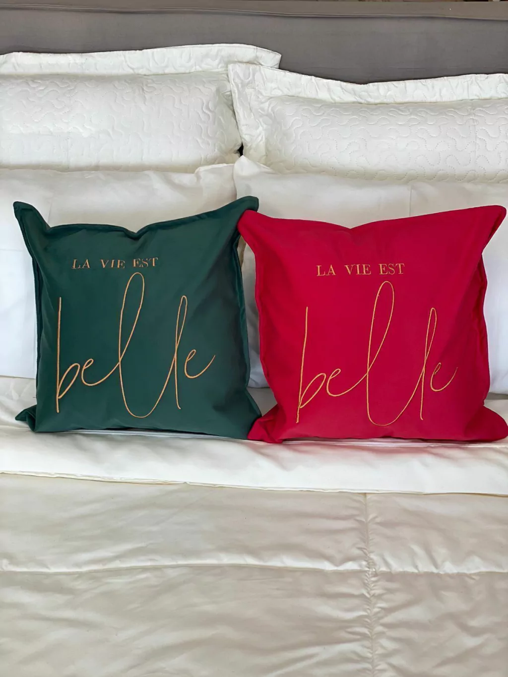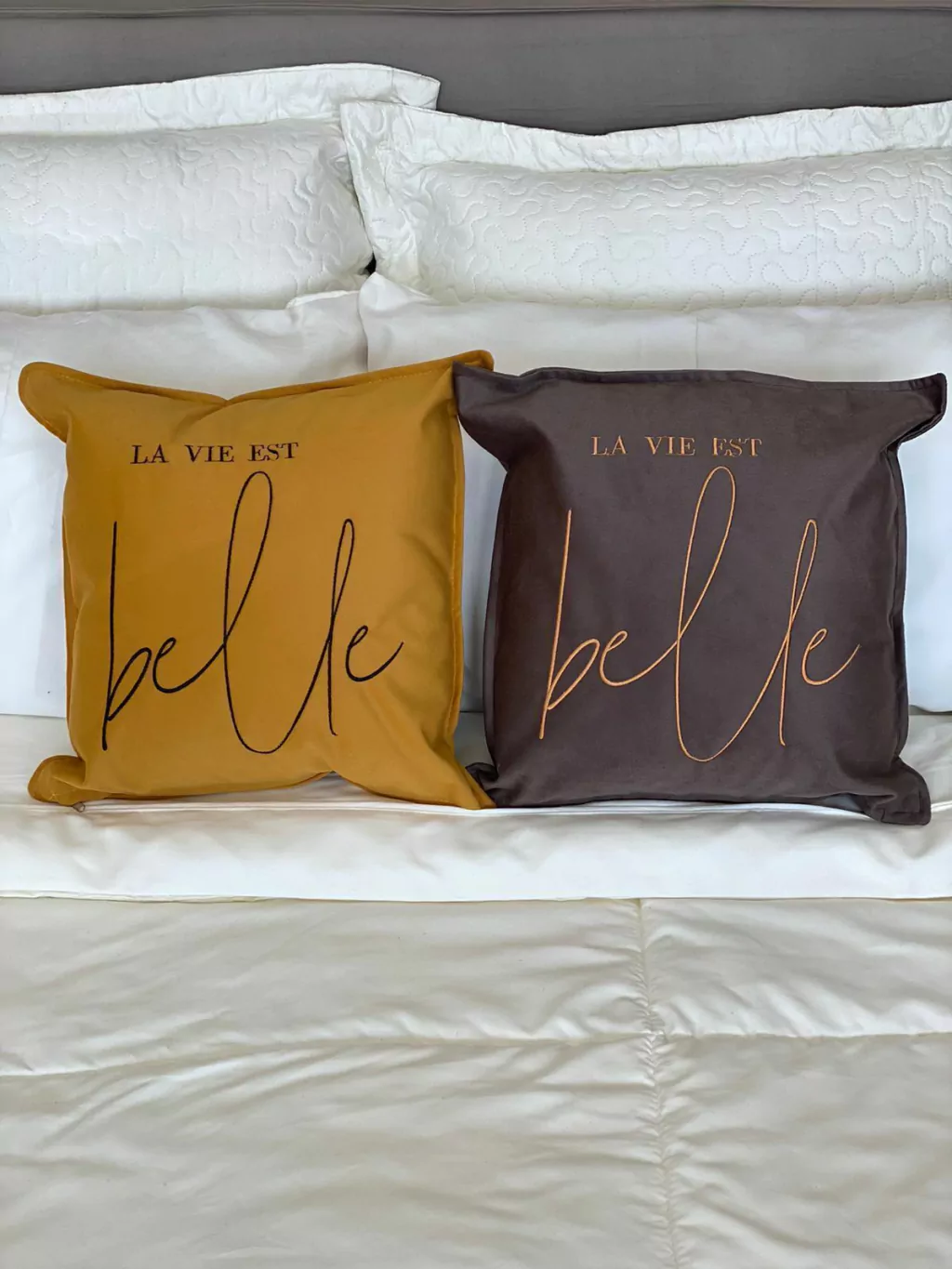 Dale un toque especial a tu espacio con nuestro Almohadón de Pana. Con un elegante bordado que dice "La vie est belle", este almohadón es perfecto para inspirar belleza y confort en tu hogar.
