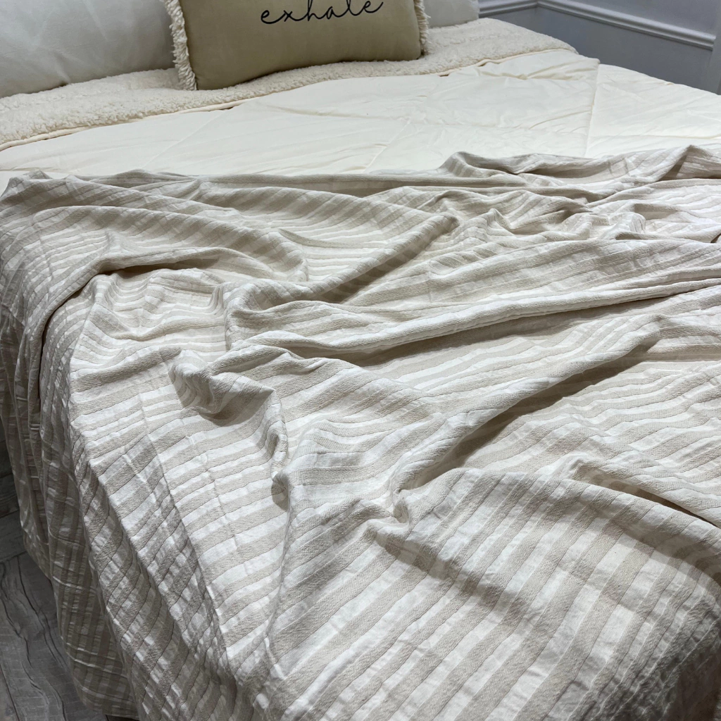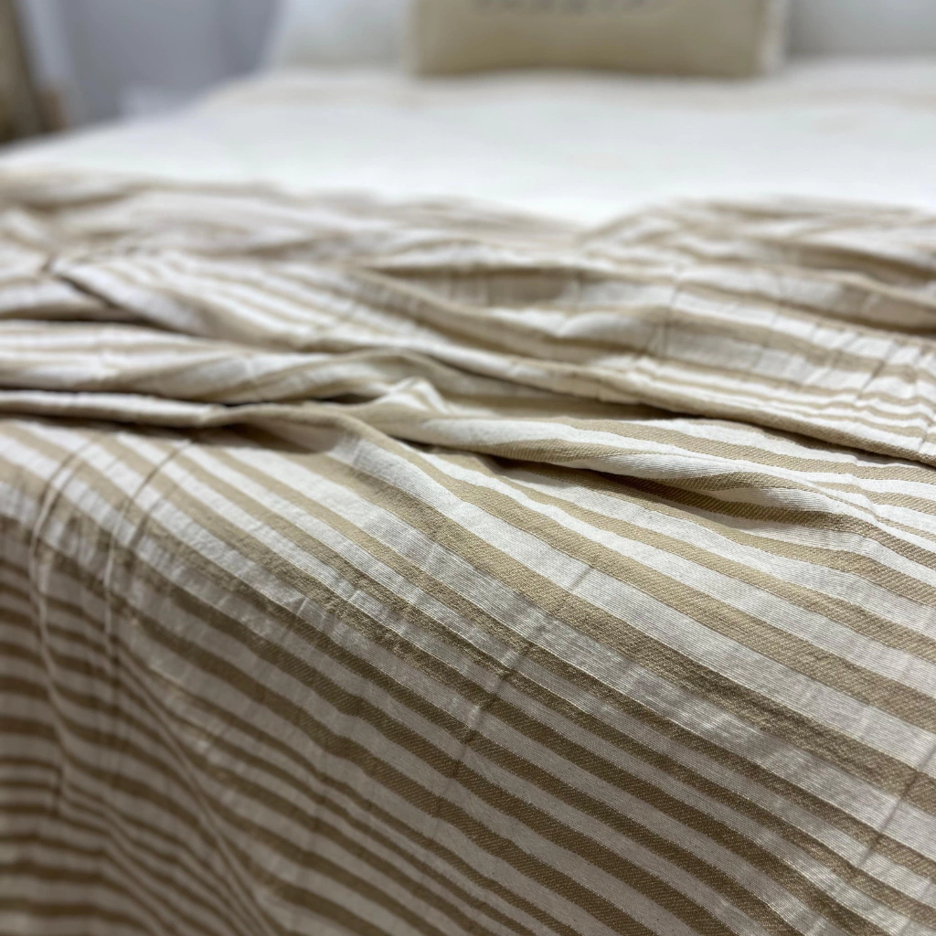 Un diseño rayado clásico y versátil, confeccionado íntegramente en algodón. Disponible en todas las medidas, es ideal para usar en cualquier estación del año. Su amplitud te asegura una cobertura completa de la cama, brindando comodidad y frescura con un estilo atemporal.