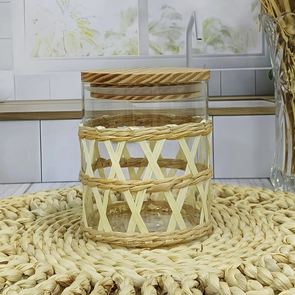 La hoja de maíz trenzada en su diseño añade un toque natural y orgánico, haciendo de este frasco una pieza única que realza cualquier ambiente. Ideal para conservar tus especias, granos o incluso como un elegante jarrón.