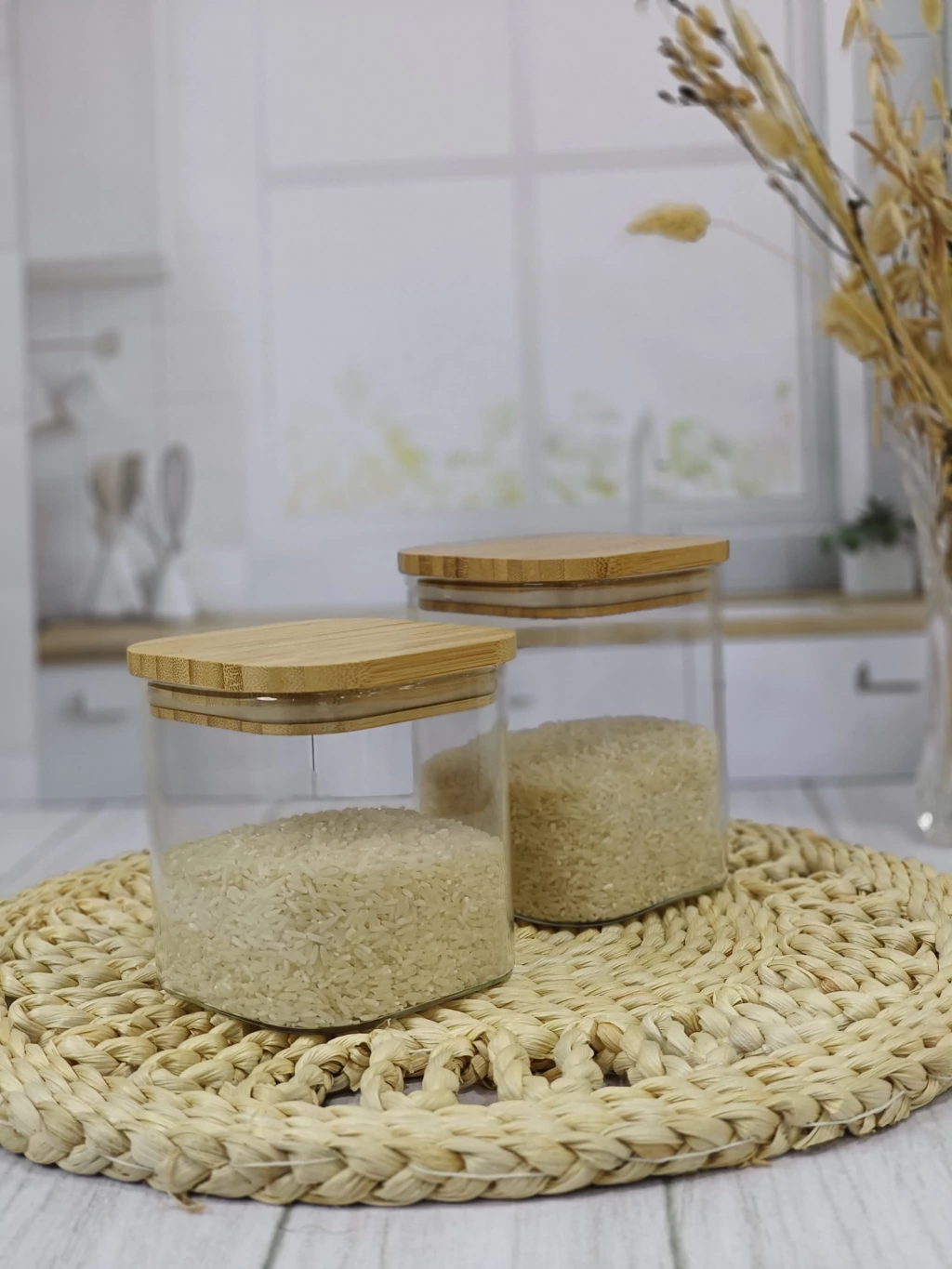 Este elegante frasco de vidrio cuadrado es ideal para almacenar tus alimentos y mantenerlos frescos. Con una tapa de bamboo que añade un toque natural a tu cocina, su diseño funcional se adapta a cualquier espacio.
