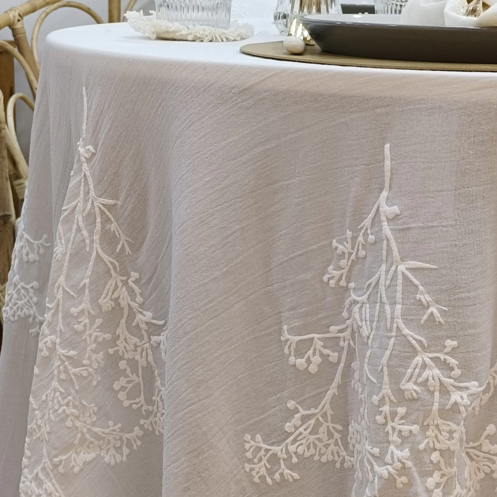 Transforma tu mesa con el elegante mantel redondo de gasa bordado. Con un diámetro de 1.80 metros, este mantel es perfecto para cualquier ocasión.