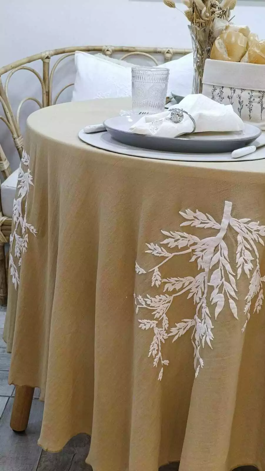 El diseño de hojas bordadas aporta un aire fresco y natural, perfecto para cualquier ocasión. Ideal para comidas familiares o reuniones con amigos, transforma tu espacio en un lugar acogedor y lleno de estilo. ¡Haz que cada comida sea especial con este mantel encantador!